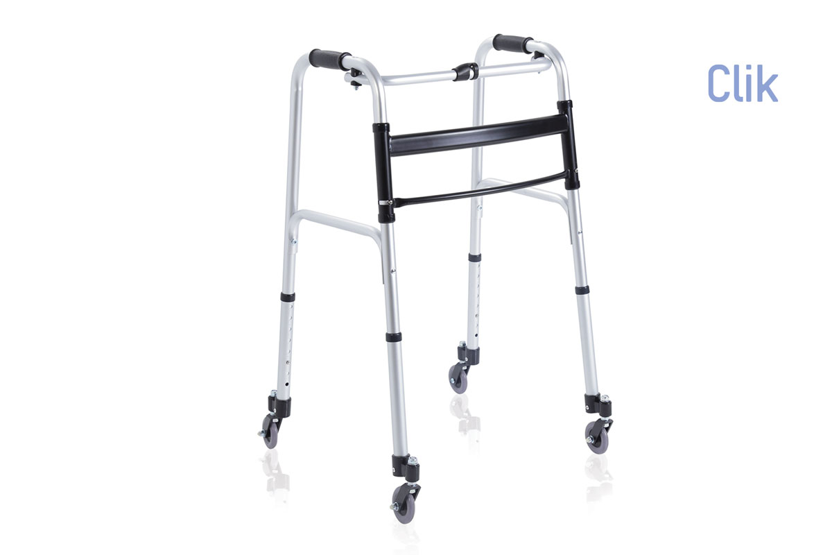 Noleggio Deambulatore pieghevole in alluminio a 2 ruote con rotazione e 2 ruote piroettanti – Moretti Click RP733